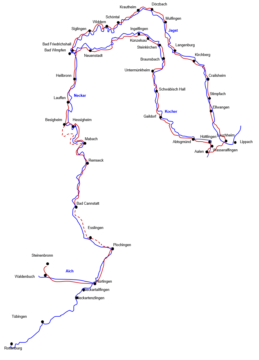 Bad Friedrichshall/Bad Wimpfen. Ab Bad Friedrichshall fährt man am besten das Jagsttal flussaufwärts. Über Langenburg, Crailsheim und Ellwangen gelangt man nach Lauchheim. Von dort geht’s über einen kurzen Anstieg nach Aalen/Wasseralfingen ins Kochertal. Jetzt den Kocher flussabwärts über Schwäbisch Hall und Künzelsau wieder nach Bad Friedrichshall. Zum Schluß geht’s wie auf der Hin-Tour den Neckar wieder zurück, und dann nach Steinenbronn. Die Tour ist auf 9 Radeltage mit je ca. 60 Km ausgelegt. Es gibt einzelne geringe Steigungen im Jagsttal, sowie in der Verbindung zwischen Jagst und Kocher.