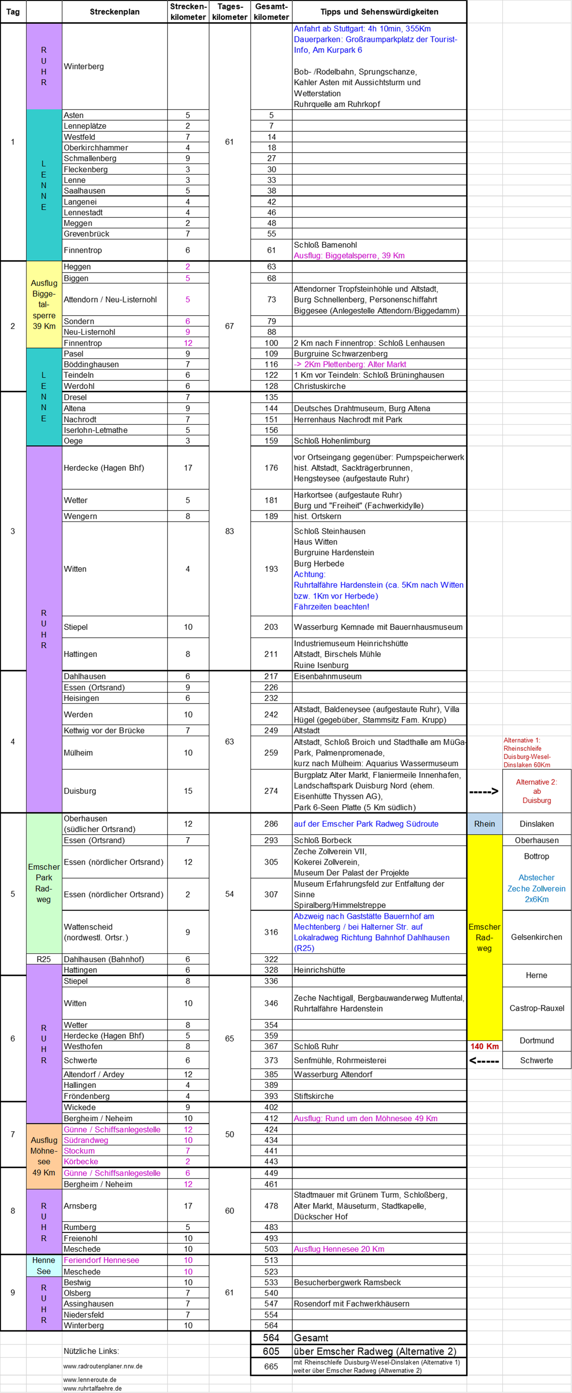 Die Lenneroute beginnt am Kahlen Asten mit einem steilen Abstieg und teils grobschotterigem Weg. Bergauf ist das nicht der Renner. Die Lenne sollte daher nur bergab gefahren werden. Wer an der Biggetalsperre übernachten will sollte in Ferienzeiten vorbuchen. Insgesamt sind die Übernachtungsmöglichkeiten an der Lenne nicht gerade üppig. In Duisburg kann man gut einen zusätzlichen Tag spendieren um z. B. eine Hafenrundfahrt zu machen. Eine alternative Streckenroute ist, so haben wir das gemacht, zuerst den Emscher Park Radweg bis zur Zeche Zollverein zu fahren und dann von dort auf den Emscher Radweg wechseln. Da die Emscher z. Zt. renaturiert wird gibt es viele Umleitungen. Dies dauert noch bis 2020. Wer Zeit hat also mit der Tour noch warten.