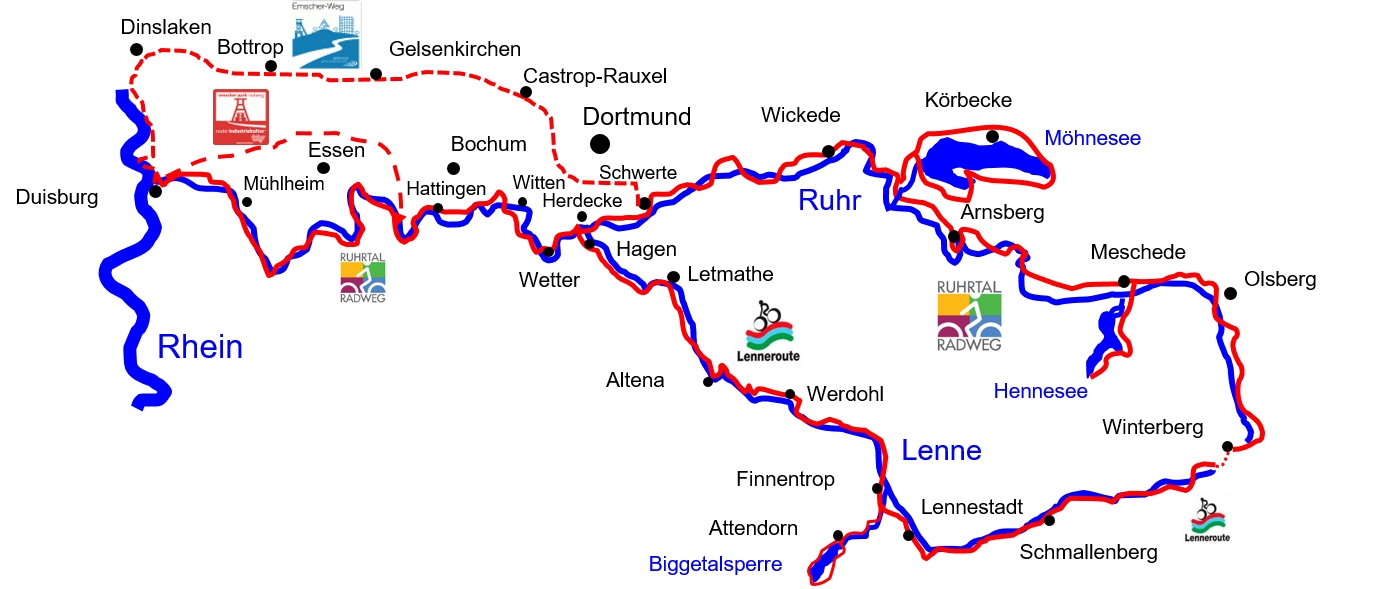 Hier entspringen nur 5Km voneinander entfernt die Ruhr und die Lippe. Beide Treffen sich wieder im Ruhrgebiet südlich von Dortmund. Die Ruhr hat dann noch einen Weg von ca. 110Km vor sich, bevor sie bei Duisburg in den Rhein mündet. Da lässt sich doch eine tolle Rundtour daraus machen! Wir starten also in Winterberg und folgen zuerst der Lenne bis sie bei Herdecke in die Ruhr mündet. Unterwegs bei Finnentrop kann man noch einen kleinen Abstecher an die Biggetalsperre einschieben. Ab Herdecke geht es über Mülheim an den Rhein. Für den Rückweg nach Winterberg kann man ab Duisburg entweder den Emscher Park Radweg oder den Emscher Weg nehmen. Emscher Park Radweg: vorbei an Oberhausen, Essen (Zeche Zollverein), Wattenscheid bis kurz vor Hattingen. Emscher Weg: ein Stück am Rhein entlang, Dinslaken, Oberhausen, Bottrop, Castrop Rauxel, um Dortmund herum bis Schwerte. Nun geht es ab Schwerte ruhraufwärts wieder nach Winterberg.