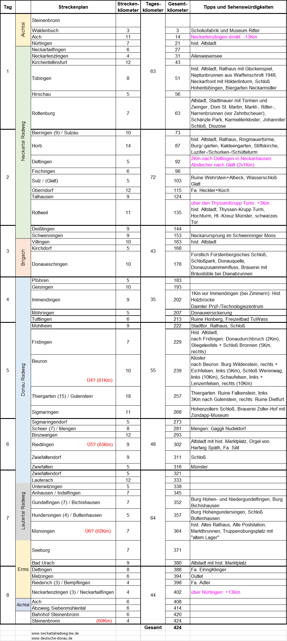 7 Km nach Horb bzw. 2 Km nach Dettingen führt ein Abstecher von einem Km nach Glatt. Hier kann man ein hübsches Wasserschloß bewundern und im Cafe feine Kuchen und Torten verspeisen. In Rottweil steht der Fahrstuhl-Testturm von Thyssen-Krupp. Auch wenn man keine Auffahrt wagt, ist er von der Route aus auch aus der Ferne gigantisch. In Donaueschingen sollte man sich unbedingt ein frisches Fürstenberg im Bräustüble gönnen. Im Sommer, wenn die Ernte läuft, sind zwischen Pfohren und Geisingen jede Menge Störche auf den Feldern. Das malerische obere Donautal sowie das große Lautertal ist ein Highlight für Naturliebhaber.