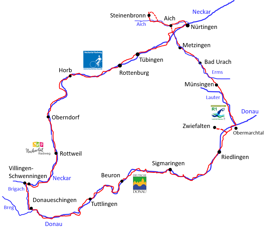 Mal wieder eine Tour mit Startort Steinenbronn. Zuerst geht es über Waldenbuch das Aichtal hinab bis Aich. Dann wechseln wir in Neckartailfingen an den Neckar. Flußauf gelangen wir über Tübingen, Rottenburg und Rottweil zur Quelle in Schwenningen. Jetzt noch ein kurzes Stück bis Villingen und dann folgen wir der Brigach bis nach Donaueschingen. An der Donau gelangen wir über Tuttlingen, Beuron, Sigmaringen, Zwiefalten (5 Km Abstecher) nach Obermarchtal. Von da an nehmen wir Kurs nach Münzingen über das Große Lautertal. An der Erms geht es nun über Urach und Metzingen wieder nach Neckartailfingen und Aich. Durch das Aichtal geht es wieder zurück nach Steinenbronn.