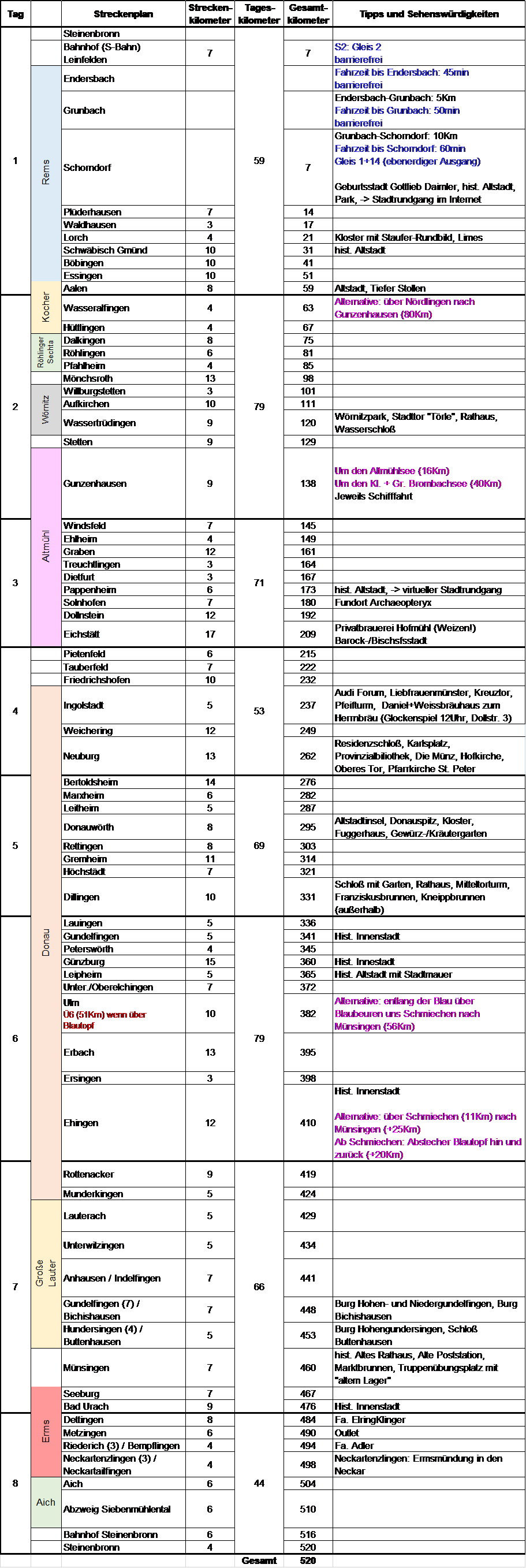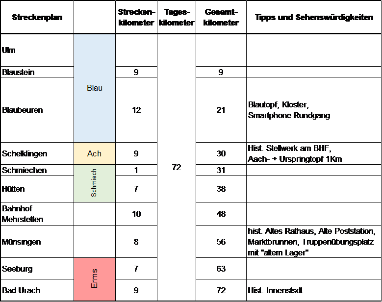 Kurz vor Aalen kommt man in Hermannsfeld an einem Hofladen vorbei. Hier gibt's leckere Backwaren, auch aus dem Automaten. Eine Übernachtung sollte unbedingt in Ulm erfolgen. Für den Abend stehen hier unzählige Restaurants und Kneipen zur Auswahl. Wer das Lautertal schon kennt, dem sei die Route entlang der Blau empfohlen. Auch bei den gerade stattfindenden Bauarbeiten am Blautopf (bis 12/2028) ist ein provisorischer Zugang eingerichtet.