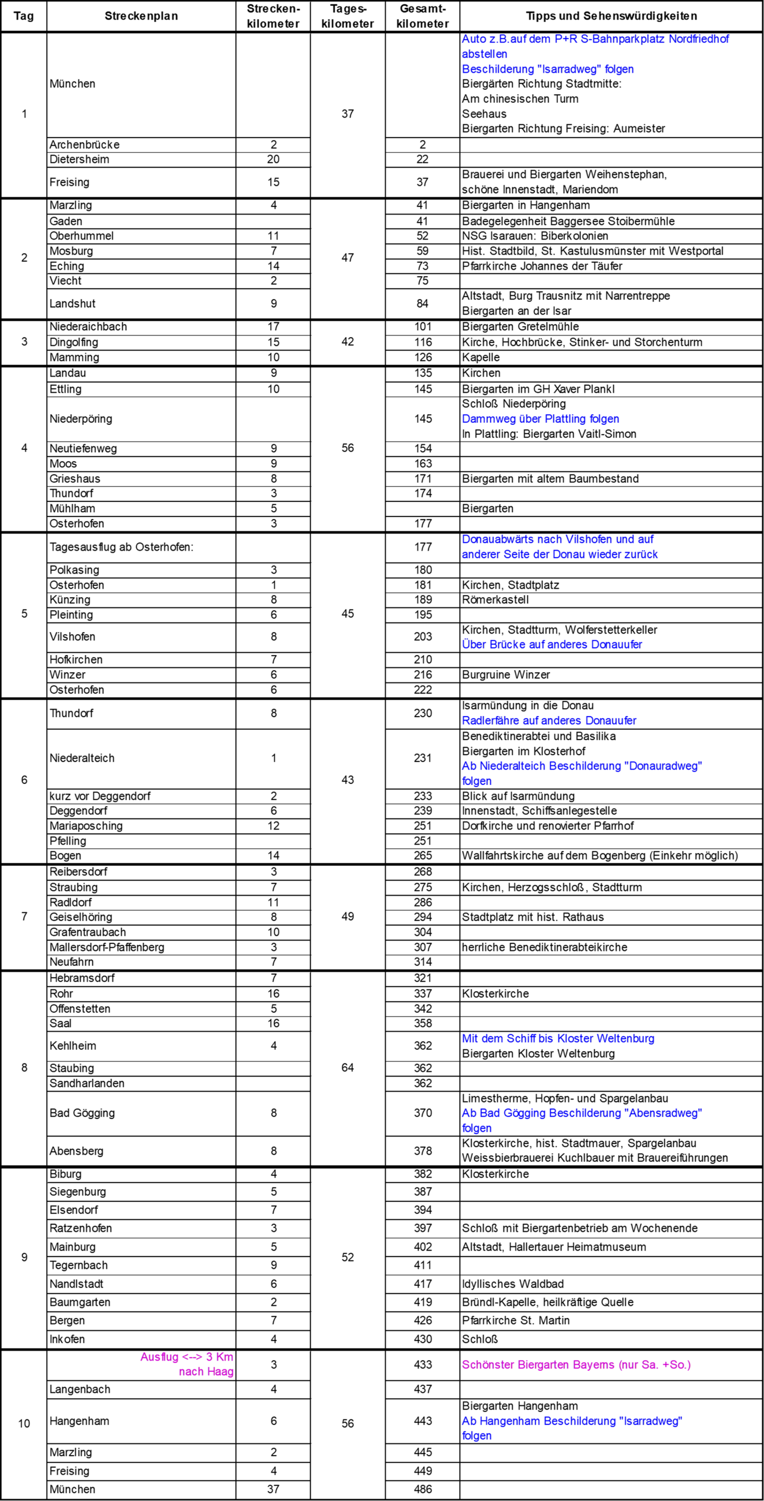 Man kann die Tour auch in Freising beginnen und am ersten Tag einen Tagesausflug nach München und wieder zurück unternehmen. So hat man genügend Zeit für Weihenstephan und den Stadtbummel in Freising zur Verfügung.