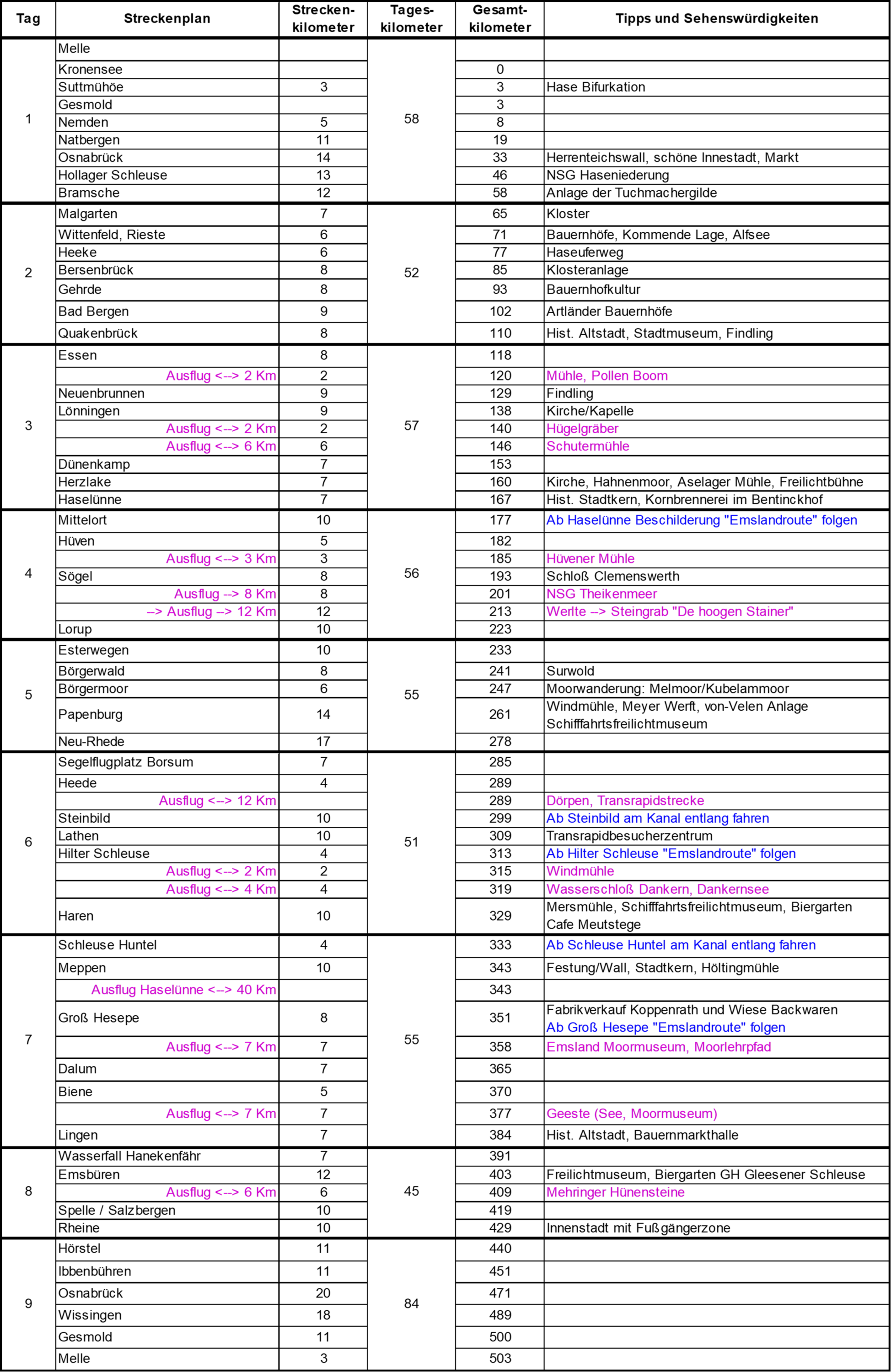 Wer gerne immer gegen den Wind radeln will, für den ist diese norddeutsche Tour genau das Richtige. Ab Melle am Haseursprung geht’s über Osnabrück, Haselünne, Papenburg, Meppen, Rheine und wieder zurück über Osnabrück nach Melle. 9 Radeltage sollte man für die