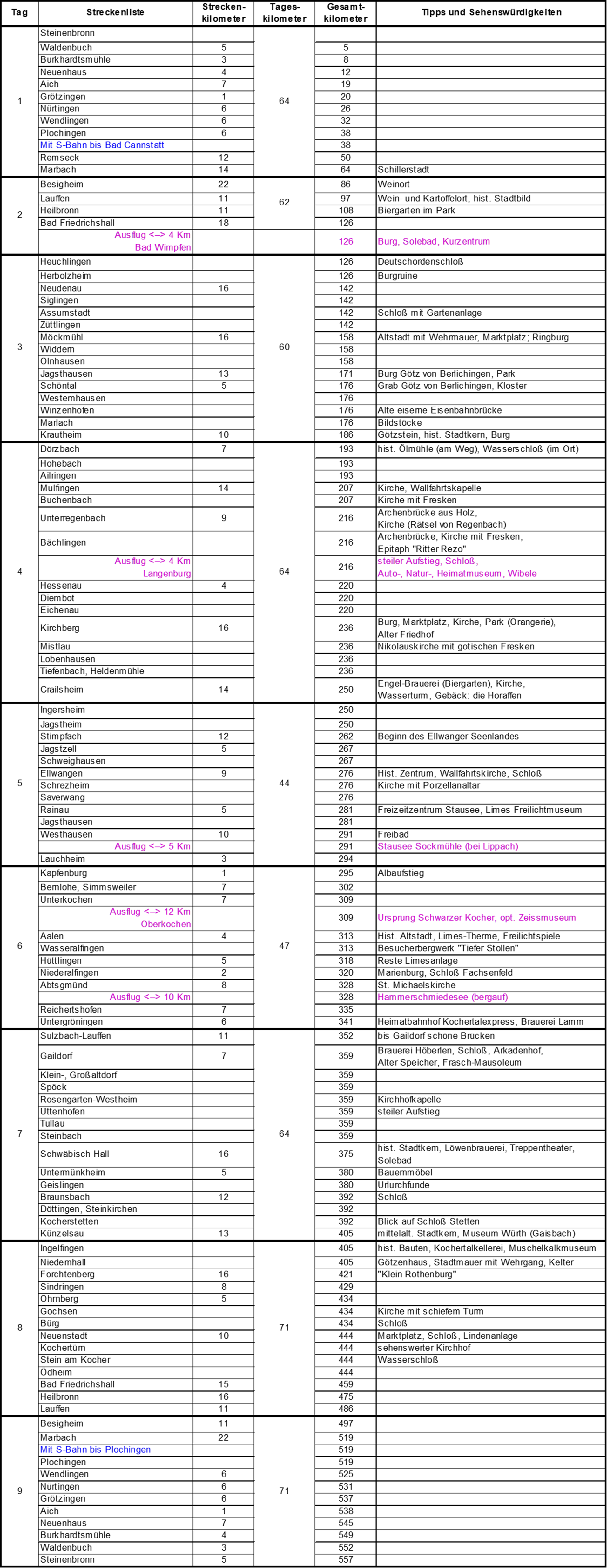 Bad Friedrichshall/Bad Wimpfen. Ab Bad Friedrichshall fährt man am besten das Jagsttal flussaufwärts. Über Langenburg, Crailsheim und Ellwangen gelangt man nach Lauchheim. Von dort geht’s über einen kurzen Anstieg nach Aalen/Wasseralfingen ins Kochertal. Jetzt den Kocher flussabwärts über Schwäbisch Hall und Künzelsau wieder nach Bad Friedrichshall. Zum Schluß geht’s wie auf der Hin-Tour den Neckar wieder zurück, und dann nach Steinenbronn. Die Tour ist auf 9 Radeltage mit je ca. 60 Km ausgelegt. Es gibt einzelne geringe Steigungen im Jagsttal, sowie in der Verbindung zwischen Jagst und Kocher.
