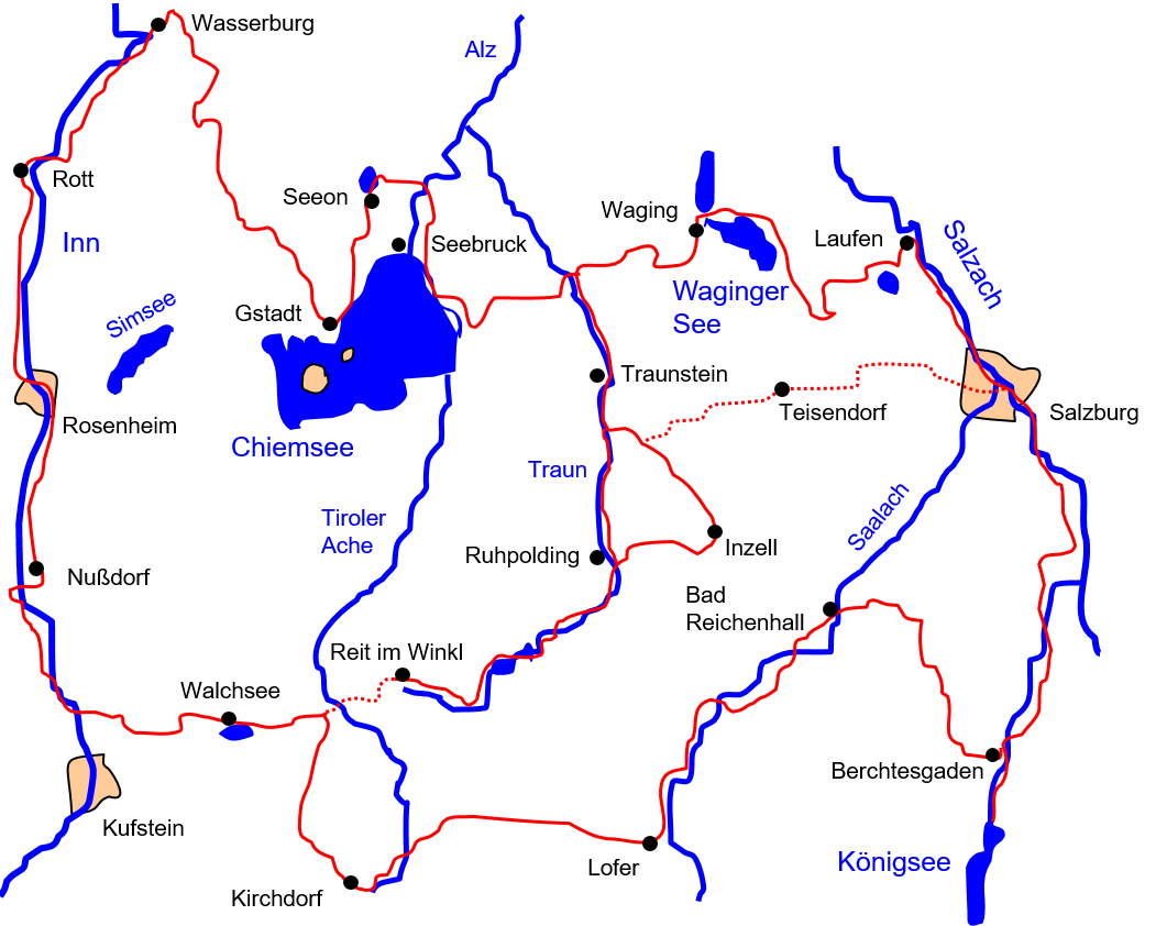Welche Radtour unternimmt man denn im Mozart-Jahr 2006? Natürlich den Mozart Radweg! Da ich aber schon den österreichischen Teil des Mozart Radwegs (ein Teilstück des Salzkammergut Radwegs) im Jahr 2000 in der Tour 8 geradelt bin, habe ich diesen Teil weggelassen und den deutschen Teil des Mozart Radweg ergänzt und leicht modifiziert, um wieder auf eine gute Woche Radlspass zu kommen. Als Startpunkt bietet sich ein Ort am oder um den Chiemsee an. Über das Kloster Seeon oder direkt am See-Nordufer entlang führt der Radweg zunächst nach Wasserburg am Inn. Innaufwärts geht’s über die Innorte Rott, Rosenheim und Nussdorf bis kurz vor Kufstein. Hier zweigt man in die Chiemgauer Berge ab. Ab dem Walchsee gelangt man über Kirchdorf, Lofer, Bad Reichenhall nach Berchtesgaden. Der Weg führt weiter über Salzburg an der Salzach entlang bis Laufen und von dort an den Waginger See. Über Traunstein und Inzell kann man einen Abstecher nach Reit im Winkl unternehmen. Zurück über Ruhpolding und Traunstein geht es wieder an den Chiemsee.