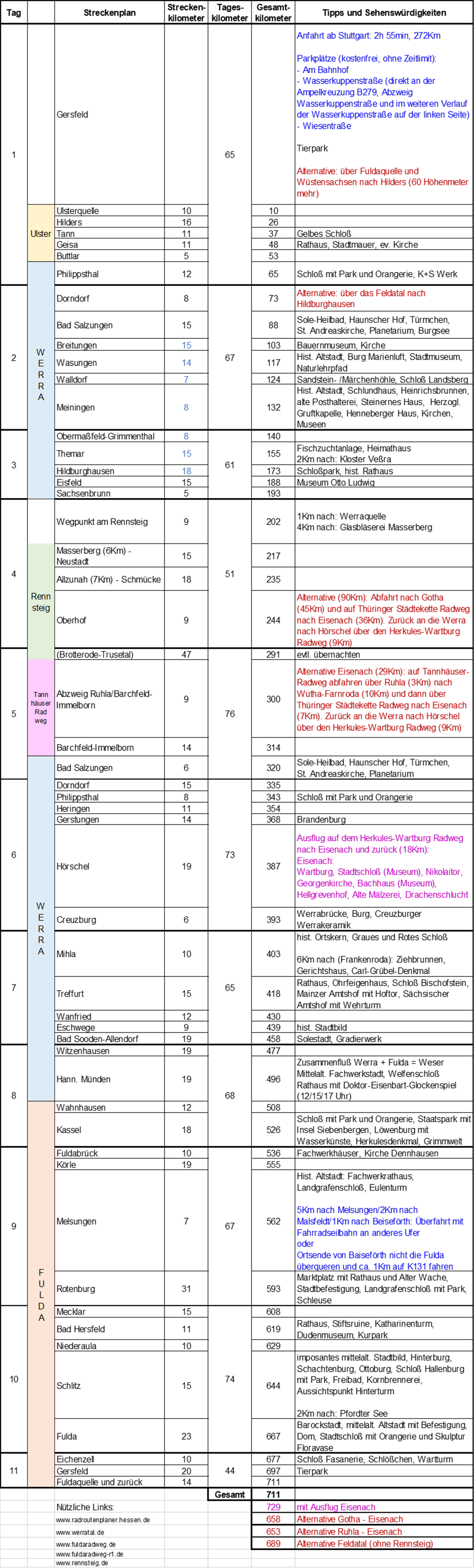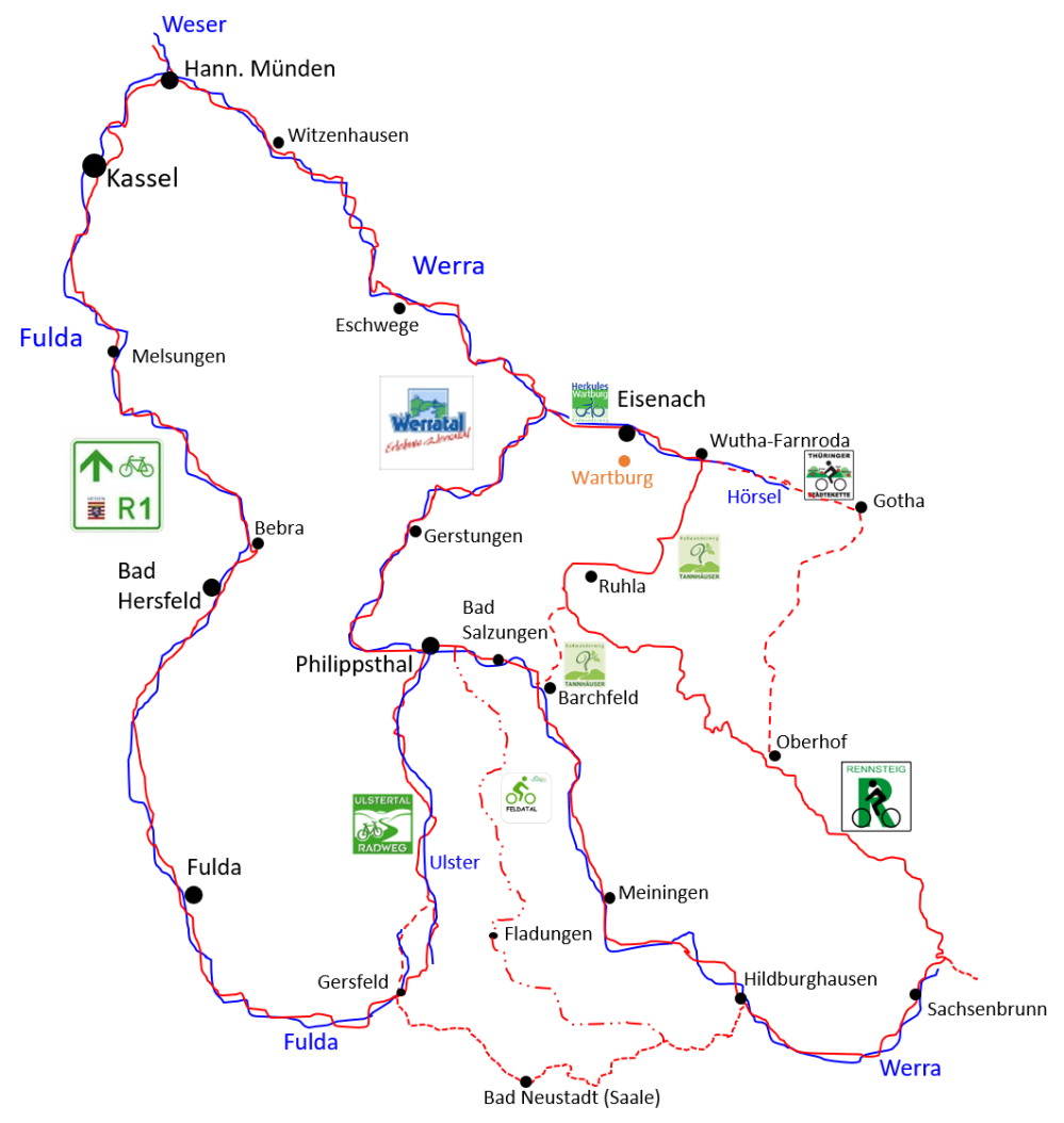 Wir starten in Gersfeld und folgen dem Ulstertal Radweg bis Philippsthal. (Alternative: über die Fuldaquelle nach Hilders an die Ulster). Jetzt geht es an der Werra bergauf bis zur Quelle bei Sachsenbrunn. Dann zunächst ein Teilstück auf dem Rennsteig Radweg bis kurz vor Ruhla. Hier gelangen wir über den Tannhäuser Radweg wieder an die Werra. Flussabwärts geht es nun bis Hannoversch Münden. Zurück nach Gersfeld kommen wir entlang der Fulda auf dem Hessischen Radfernweg R1 (Fulda Radweg). Alternativen: Ab Oberhof über Gotha oder ab Ruhla zum Thüringer Städtekatte Radweg nach Eisenach. Von dort über den Herkules Radweg zurück an die Werra.