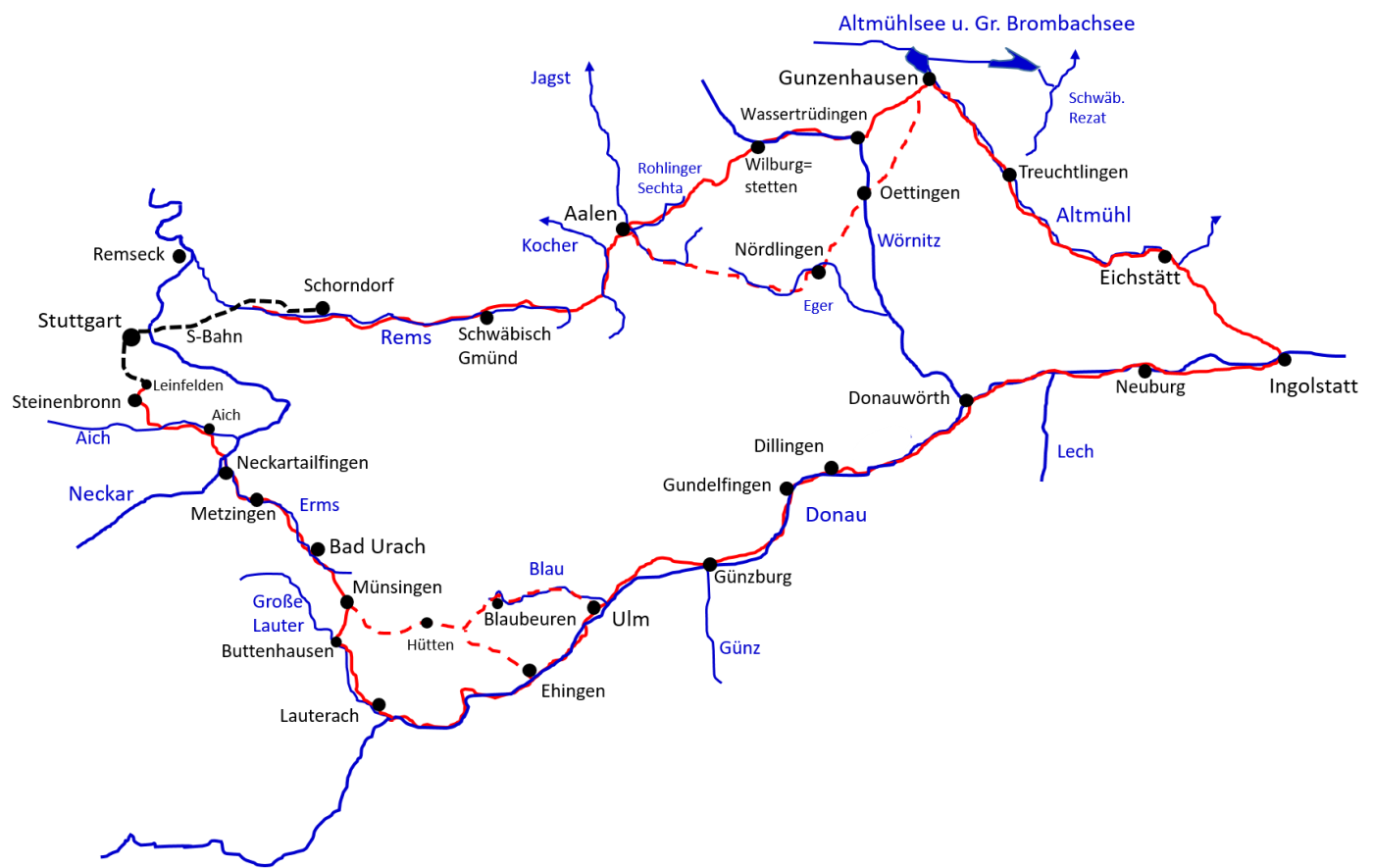 Als Startpunkt kann Steinenbronn bzw. Stuttgart gewählt werden. Mit der S-Bahn geht's bis Schorndorf. An der Rems folgen wir dem Radweg bis Aalen. Von hier geht es entweder über Wassertrüdingen oder über Nördlingen/Öttingen nach Gunzenhausen. Hier fahren wir bis kurz nach Eichstätt auf dem Altmühltalradweg, bevor wir nach Ingolstatt abbiegen. Von hier aus geht es Donau aufwärts über Neuburg und Dillingen nach Ulm. Ab Ulm nach Münsingen entweder über Ehingen und dann das Lautertal hinauf, oder ab Ulm an der Blau nach Blaubeuren und dann über Schelklingen das Schmiechtal hinauf bis Münsingen. Von hier ist es nur ein Katzenprung bis Bad Urach. Zuletzt an der Erms über Metzingen an den Neckar, dann über das Aichtal wieder zurück nach Steinenbronn bzw. Stuttgart.